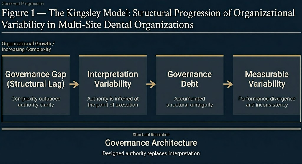 A structural progression of how variability emerges in multi-site dental organizations.
